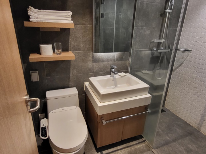 객실문 오른편으로는 욕실이 있다. 욕실은 아담한 편인데 변기, 세면대, 샤워 칸으로 구성되어 있다. 5인 기준 룸이라 그런지 페이스 타월이 5장 구비되어 있었다. 타월 컨디션이 매우 좋음.