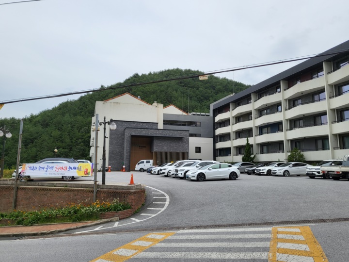덕구온천리조트 콘도 주차장 1층 쪽으로도 주차장이 여유롭고, 지하 1층과 연결된 주차장에서는 전기차 충전도 가능하다. 추석 연휴 마지막 날이라서 투숙객이 많지 않을 것으로 예상했는데, 밤에 보니 생각보다 불 켜진 객실이 많았다.