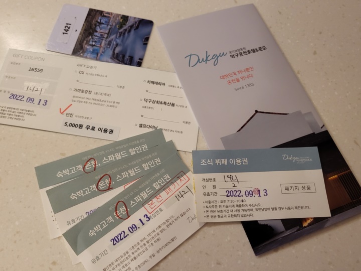 특별혜택으로 온천무제한 이용권, 2인 조식 뷔페 이용권, 던킨도너츠 5,000원 쿠폰이 포함되었다. 호텔 스위트 테라스 객실만 3인 이용 시 34만 원이었으니 콘도 패키지가 훨씬 가성비 좋다. 온천도 3번 (대온천장 2번, 스파월드 1번 1인당 5천 원 추가금) 이용했으니 온천 무제한 패키지 제대로 뽕뽑고 온 셈이다.