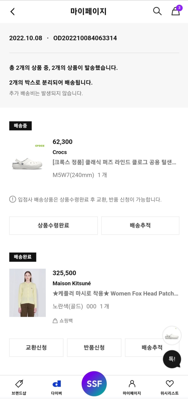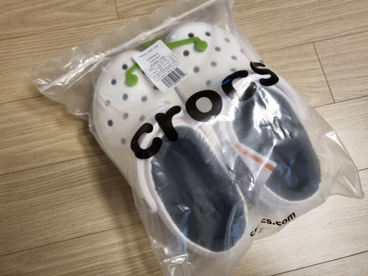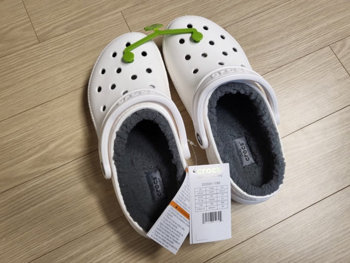 화이트-그레이 크록스 털슬리퍼도 구입하고 싶었는데 두 켤레 사면 10만 원 넘어가니까.... 사 오고 싶었지만 포켓몬 크록스와 지비츠 3개만 구입해서 왔다. 그리고 신고 싶었던 클래식 퍼즈 라인드 클로그 털 샌들은 SSF샵에서 구입, 오늘 수령했다.