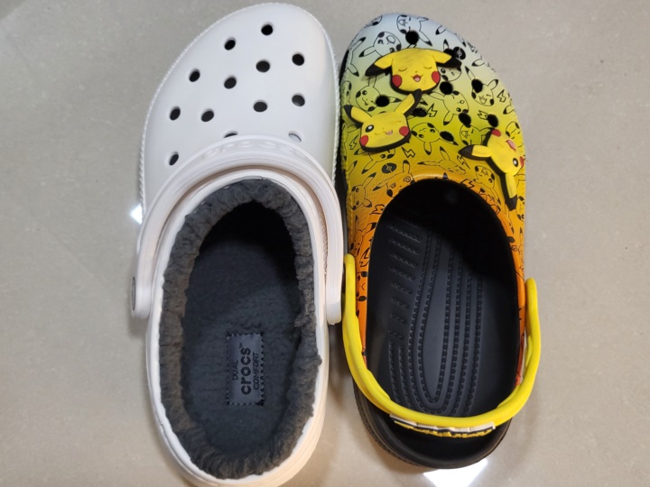 아이가 신는 포켓몬 크록스 사이즈는 M5W7, 내가 신으려고 구입한 털 크록스도 M5W7인데 털 안감 달린 게 좀 더 크다. 공용과 아동용 사이즈의 차이인 건가...?