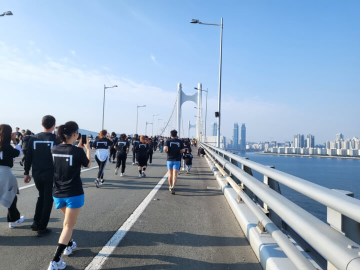 10km 참가자인 남편은 오전 8시에 모여 광안대교 상판 출발지로 먼저 이동을 했고, 5km 건강달리기 참가자는 근처에서 조금 더 대기했다가 8시 40분쯤 출발지로 이동했다.