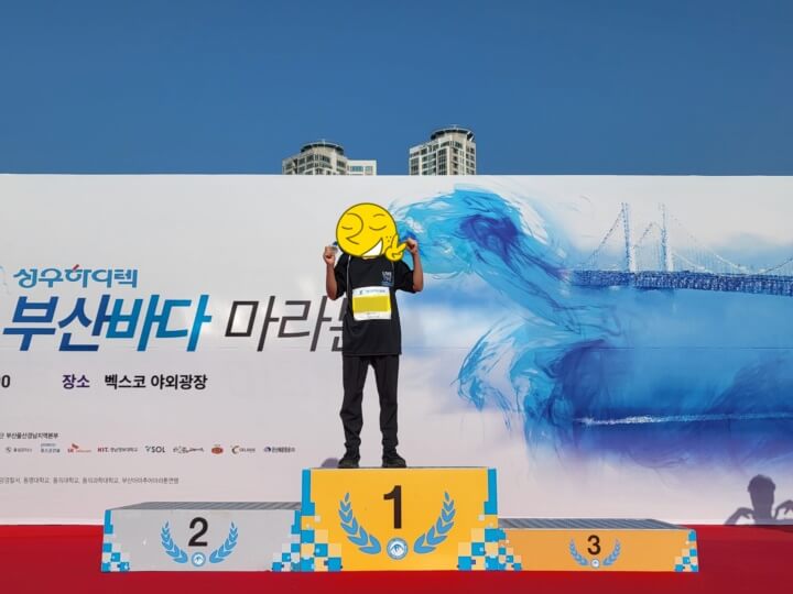 행사장 무대에서 기념촬영도 가능해서 사진도 찍었다. 광안대교 건강달리기 5KM 47분대이지만 마음만은 1등인 걸로 ㅎㅎㅎㅎ