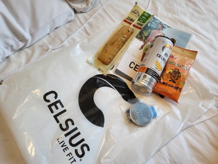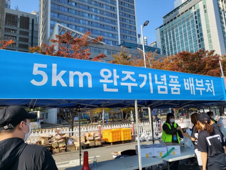 건강 달리기는 물 안 줄 거라고 생각했는데 5KM 종료지점에 도착하면 생수를 한 병씩 준다. 벡스코 야외광장에 도착하면 5KM 10KM 각각 완주 기념품 배부처에 줄을 서서 기념품을 수령한다. 완주 기념품은 고래사 어묵, 셀시어스 캔음료, 머거본 군옥수수맛 아몬드, 메달이었다. 10K도 이와 동일하다.