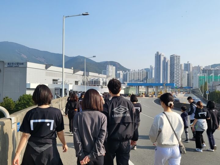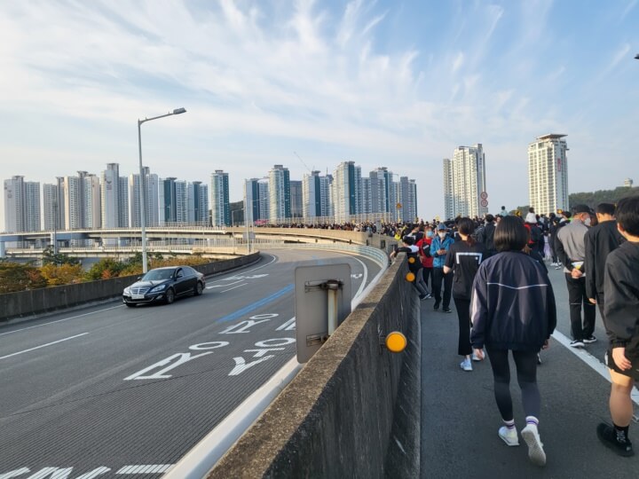 광안대교 전면 통제되었던 10월 23일 일요일 오전, 벡스코 야외광장에서 광안대교 출발지까지는 도보로 1km정도? 선두를 따라서 걷는데 워낙 참가자가 많기 때문에 현수막이 보이지 않을 정도였다.