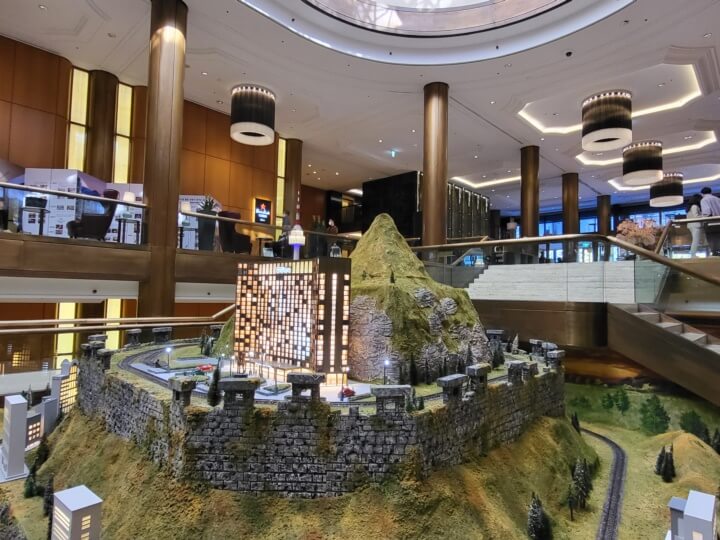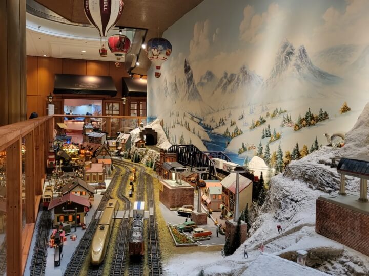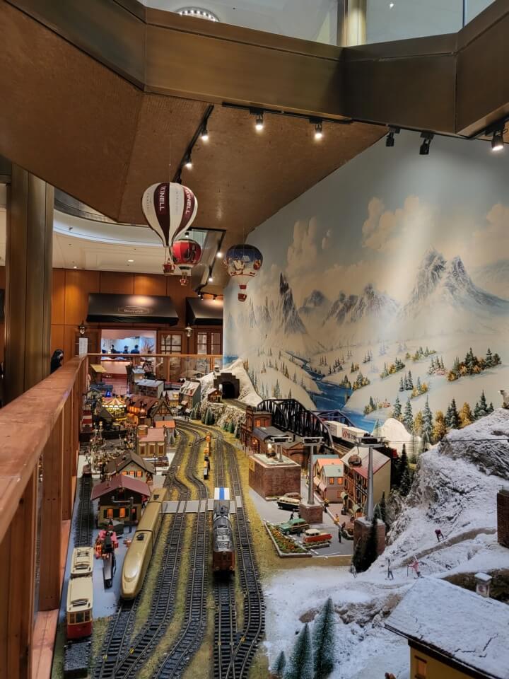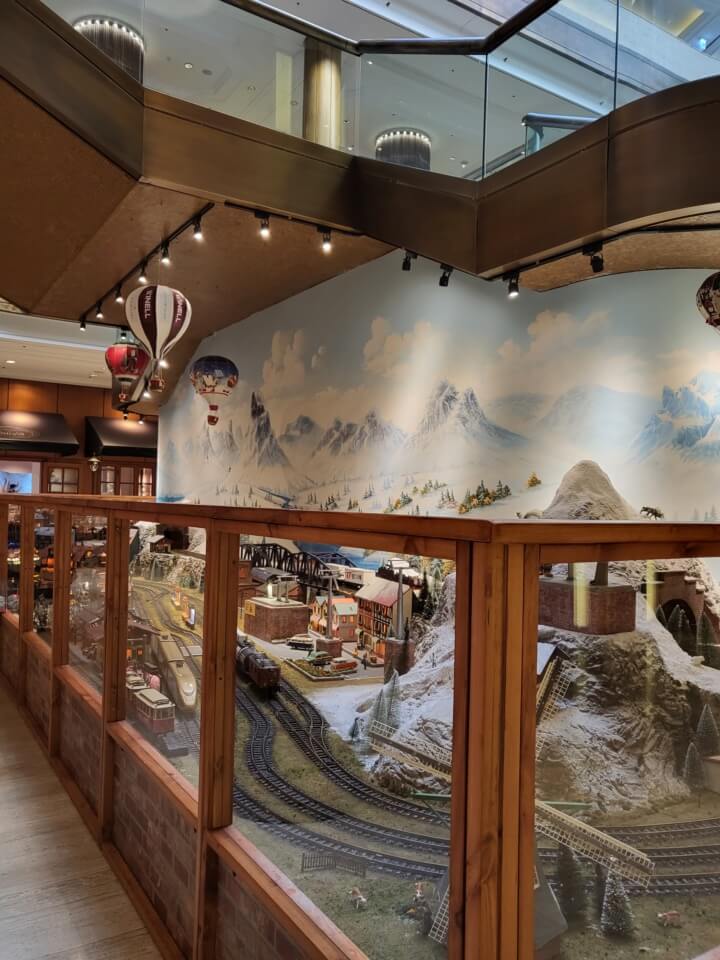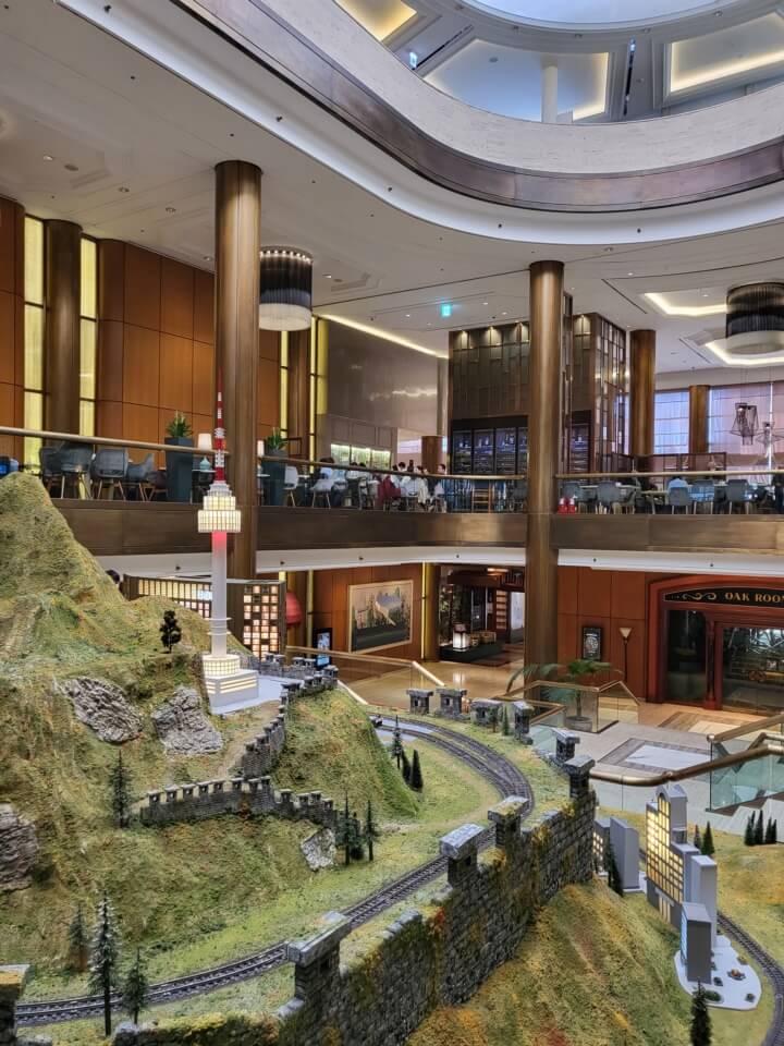 로비 계단 아래로 빙 둘러 설치된 미니어처 힐튼 열차, 볼 때마다 계속 운행중이어서 브레이크 타임이 있는 줄도 몰랐다 ㅎㅎㅎ 달리는 기차 따라서 질주하는 어린 아이들이 있기 마련이라 사진 촬영할 때 특히 부딪힘 주의해야 한다.
