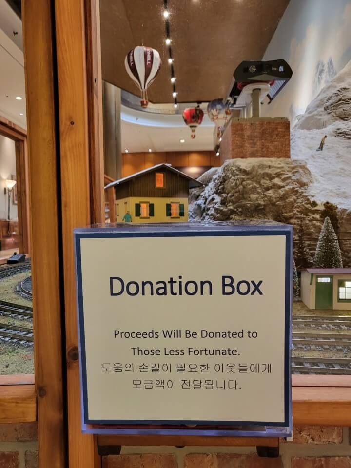 힐튼 열차가 설치된 유리벽 곳곳에 도네이션 박스가 설치되어 있다. 모금액은 도움의 손길이 필요한 이웃에게 전달된다고 한다.