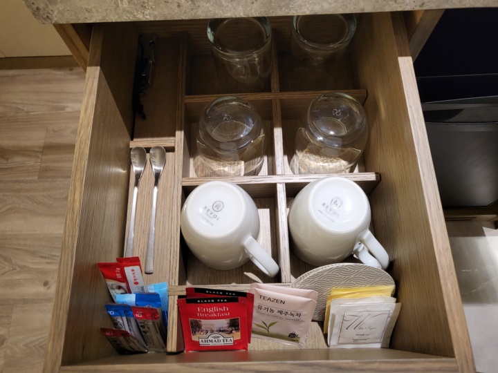 생수는 2병이 무료이고, 미니바 (냉장고 안) 음료와 스낵은 모두 유료이다. 호텔 건물 1층에 편의점이 있으므로 맥주 등 음료수 마시고 싶다면 편의점 이용하면 된다. 나는 근처 GS25편의점을 이용했는데, 우리 동네에서는 좀처럼 보기도, 구하기 힘든 원소주가 여러 병 진열되어 있어서 신기했다 ㅎㅎㅎ