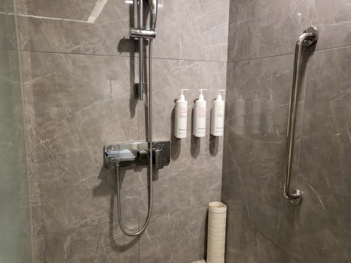 욕실은 작은 구조를 알차게 뽑아낸 스타일로 세면대 중심으로 왼쪽에는 변기칸과 샤워칸이, 오른쪽에는 욕조가 있는 구조이다. 욕실 제품은 다회용 펌프식으로 벽면에 부착되어 있는데 this work 제품으로 샴푸, 컨디셔너, 바디워시가 준비되어 있다.