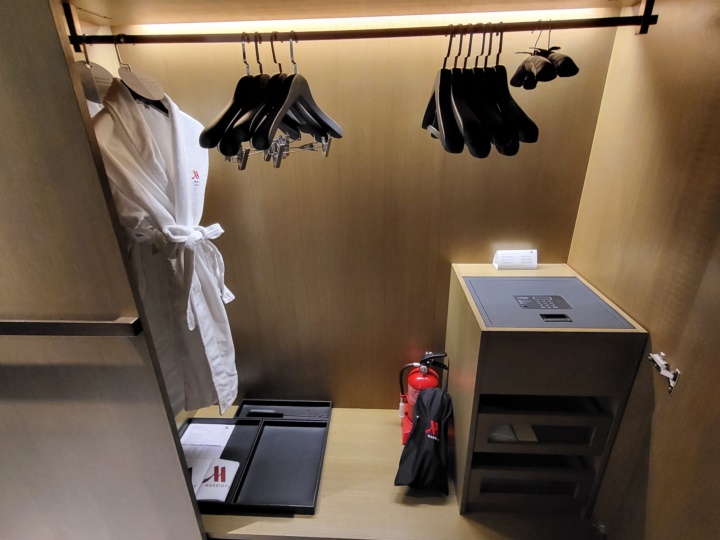 출입문 옆쪽으로 금고, 다리미, 소화기 등이 준비되어 있고 배쓰로브도 2벌 준비되어 있다. 슬리퍼도 2족만 준비되어 있어서 전화로 요청드렸더니...