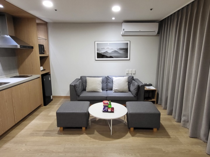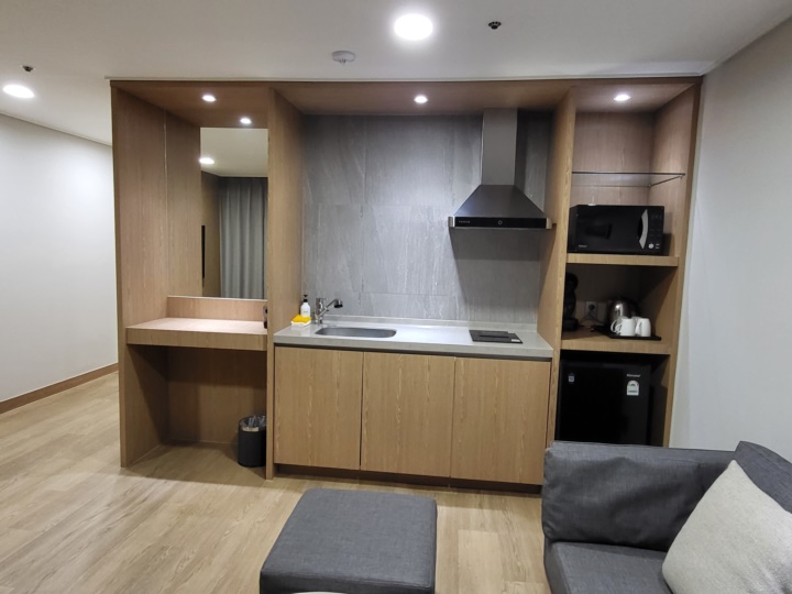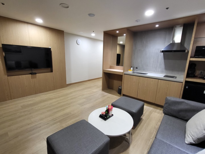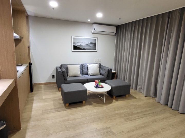 욕실 옆으로 쭉 들어오면 거실이 있다. 거실에는 소파와 테이블, 화장대, 싱크대, 전자레인지와 미니 냉장고 등이 있다.
