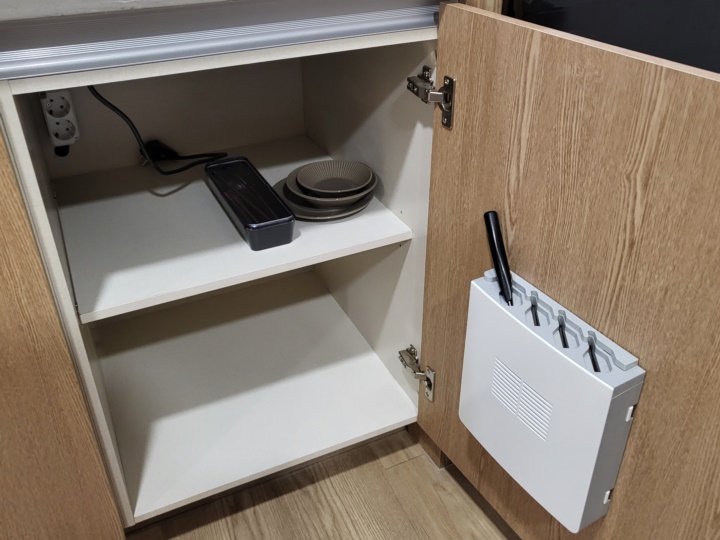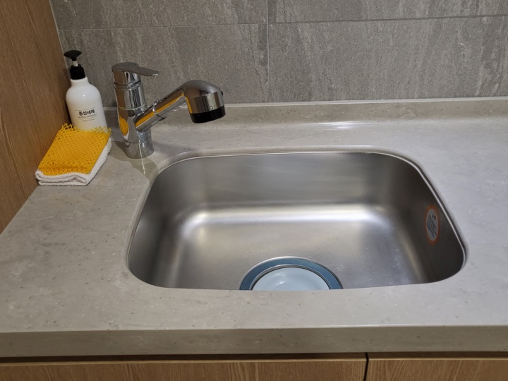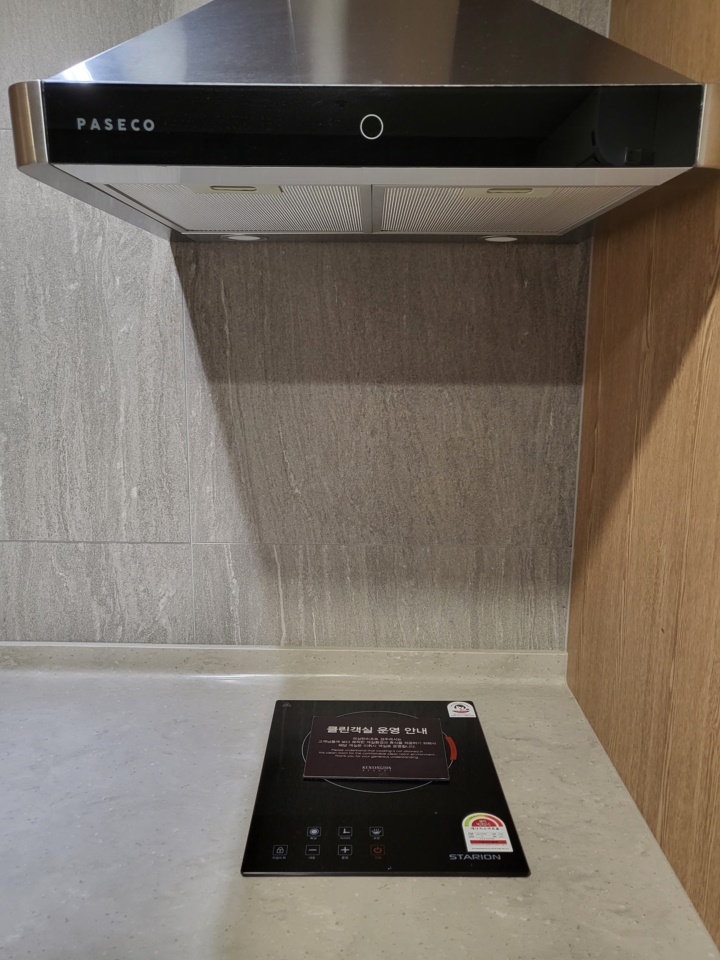 싱크대와 세제, 간단한 식기류가 있어서 취식이 가능하지만, 클린룸이라 취사는 불가하다. 1구 인덕션과 후드가 있지만 사용할 수 없게 되어 있다. 포장해와서 먹거나 전자레인지를 사용해서 데워 먹을 수는 있다.