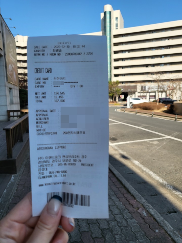 켄싱턴 디럭스 객실 정상요금은 39만 원이고 요일, 연휴, 성수기 등에 따라 개인회원, 법인회원, 분양 회원카드 대여 이용요금이 조금씩 다르다. 금요일 법인회원 이용요금으로 137,000원 결제하였다. (체크아웃 시 카드키 반납하면서 결제) 기준인원 외 인원 추가 시 1인 5,000원 (36개월 이상) 침구 추가 5,000원 추가 요금 발생한다
