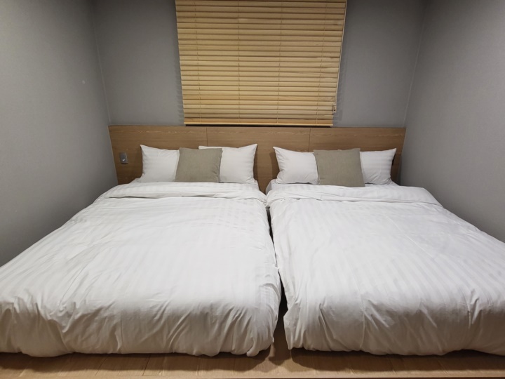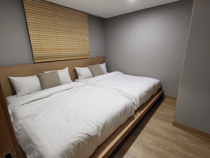 방에 더블베드 2개가 거의 붙어있는 구조로 이 방이 복도 쪽으로 나 있어서 창문을 열어두고 잘 경우에 숙면에 방해가 될 수 있다. 지금은 겨울이라 괜찮지만, 여름에는 더 신경 쓰일 수 있을 것 같다. 왜냐면 거실에는 에어컨이 있지만, 방에는 선풍기만 있기 때문이다. 안쪽 침대 발 쪽으로 벽장이 있어서 옷걸이와 선풍기가 들어있다.