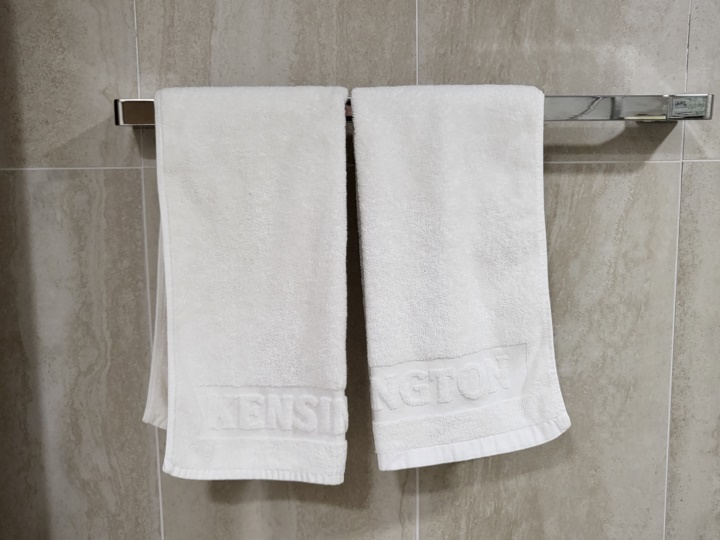 리모델링 타입인 켄싱턴 객실은 4인 기준이라 수건도 4인 기준으로 넉넉하게 준비되어 있었다. 세면타월 2장이 걸려있고, 목욕타월과 여분의 세면타월이 욕실 선반 위에 준비되어 있었다.