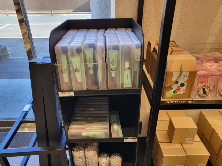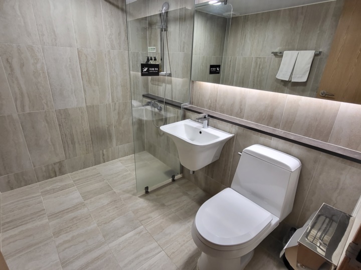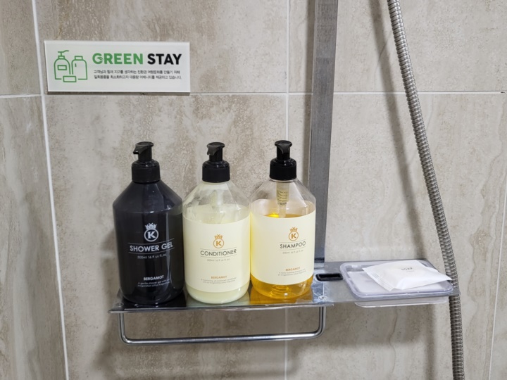 치약, 칫솔 등 일회용품은 비치되어 있지 않다. 다회용으로 샤워젤과 샴푸, 컨디셔너가 준비되어 있으며 비누도 제공된다.