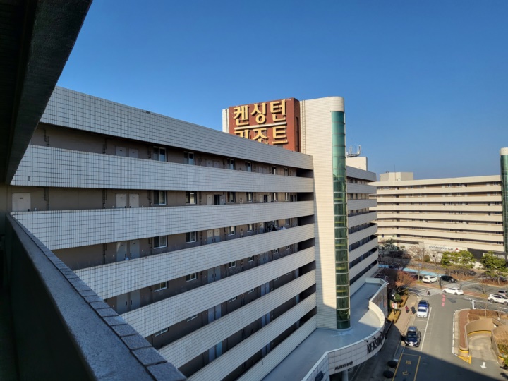 경주 켄싱턴리조트 본관에서 바라본 서관의 모습, 켄싱턴리조트 바로 옆에 한화리조트가 있다. 지하 주차장이 여유롭지만, 대부분 지상주차장에 주차를 한 것 같다. 지하 내려가 봤는데 지하주차장은 텅텅 비어서 오잉? 했다 ㅎㅎㅎ