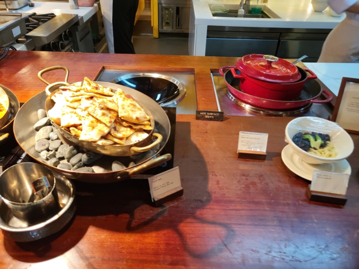 난을 비롯한 야채 카레와 요거트 소스 등이 준비되어 있는 인도 음식 코너