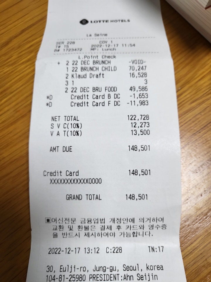 롯데호텔 라세느 뷔페 할인 카드 2022년 12월 브런치 가격으로 성인 18만 원, 어린이 8만 5천 원이라 음료 가격까지 합산하면 총 46만 5천원 정도를 결제해야 했다. 하지만, 삼성 the 1 카드 바우처 2인 사용하고 (12월이라 1인당 3만 원씩 추가) 맥주 2잔에 어린이 뷔페 가격 포함해서 총 148,501원 결제하였다. (삼성 아멕스 더원카드로 결제 시 푸드 10%, 음료 10% 할인 적용)