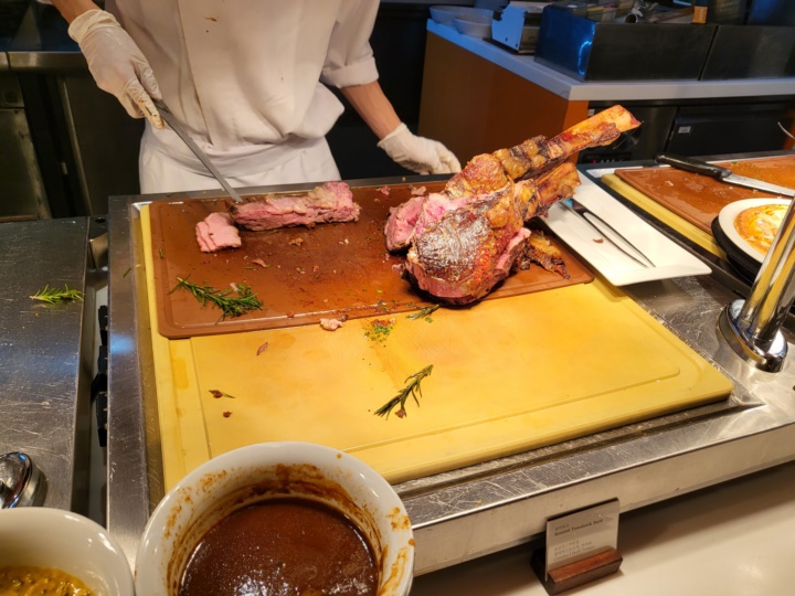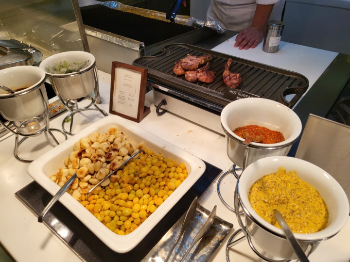 롯데호텔 서울 라세느 뷔페에서 가장 인기 있다고 할 수 있는 양갈비 구이, 호주산 양고기와 구운 마늘, 은행을 먹을 수 있다. 스테이크 소스, 머스터드 소스, 민트 소스 중 취향에 맞는 소스와 곁들여 먹으면 된다.