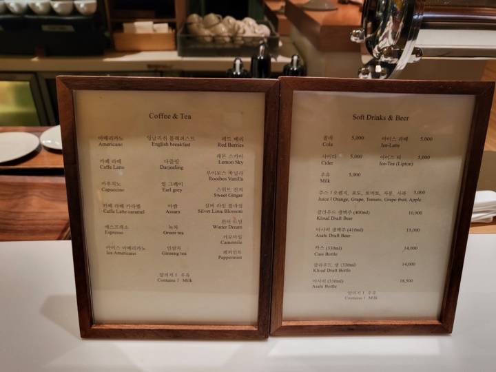 롯데호텔 서울 뷔페 라세느 기본 세팅 생수와 탄산수(산펠레그리노) 1병이 기본 제공되며, 주류 및 소프트 드링크는 유료이다.