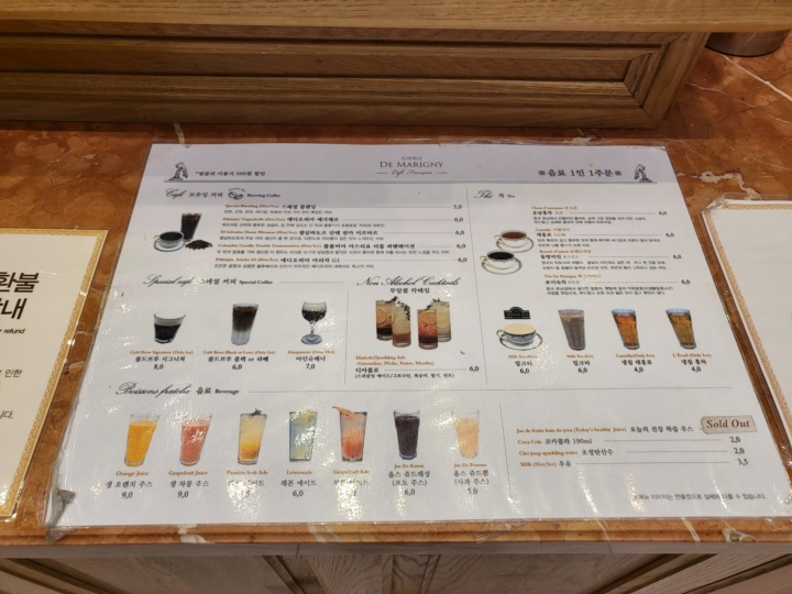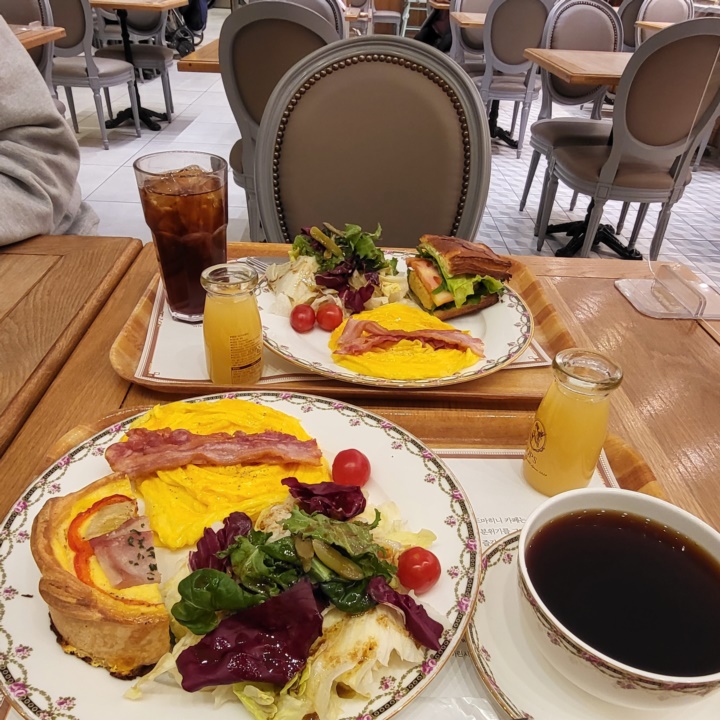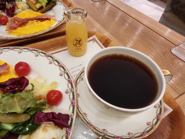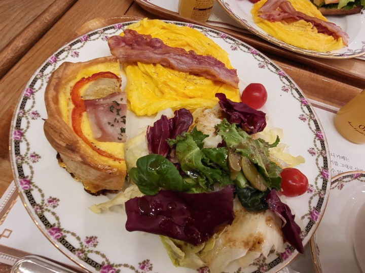 메인이라고 할 수 있는 샌드위치와 키슈만 선택이고 나머지 구성은 동일하다. 푸딩병에 사과주스가 나오고, 음료는 커피는 ice와 hot 중 고를 수 있다. 샐러드, 스크램블 에그, 베이컨, 키슈 또는 샌드위치, 커피, 사과주스 구성이 11,000원이면 만족스럽다 생각했는데 맛은 아주 좋은 편은 아니다. 특히 스크램블 에그;;;;