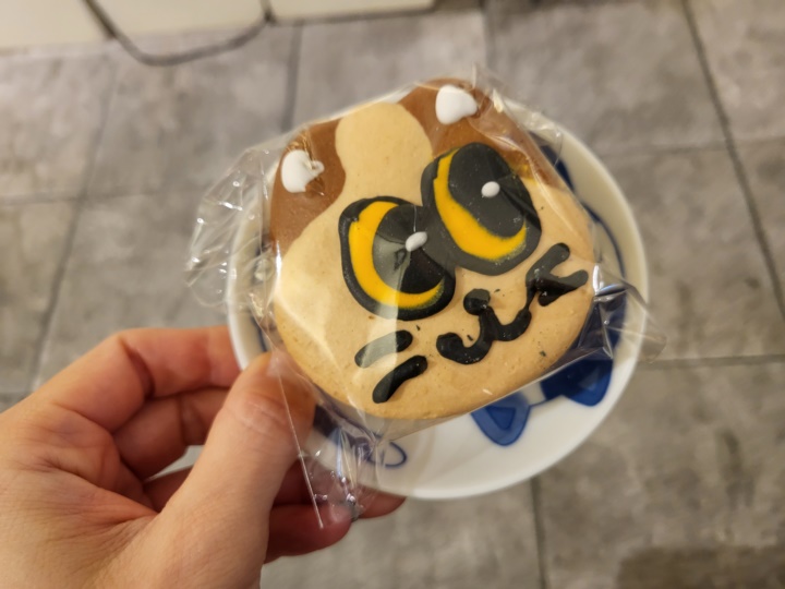 레몬에이드를 못 마셔 슬퍼진 아이는 마카롱을 하나 먹고 싶다고 했다. 그래서 주문한 나고 마카롱. 마카롱이 왕 큰 뚱카롱이다 ㅋㅋㅋ 캐릭터가 그려져 있는데 아이가 선택한 것은 고양이 나고였고, 가격은 3,500원이었나?