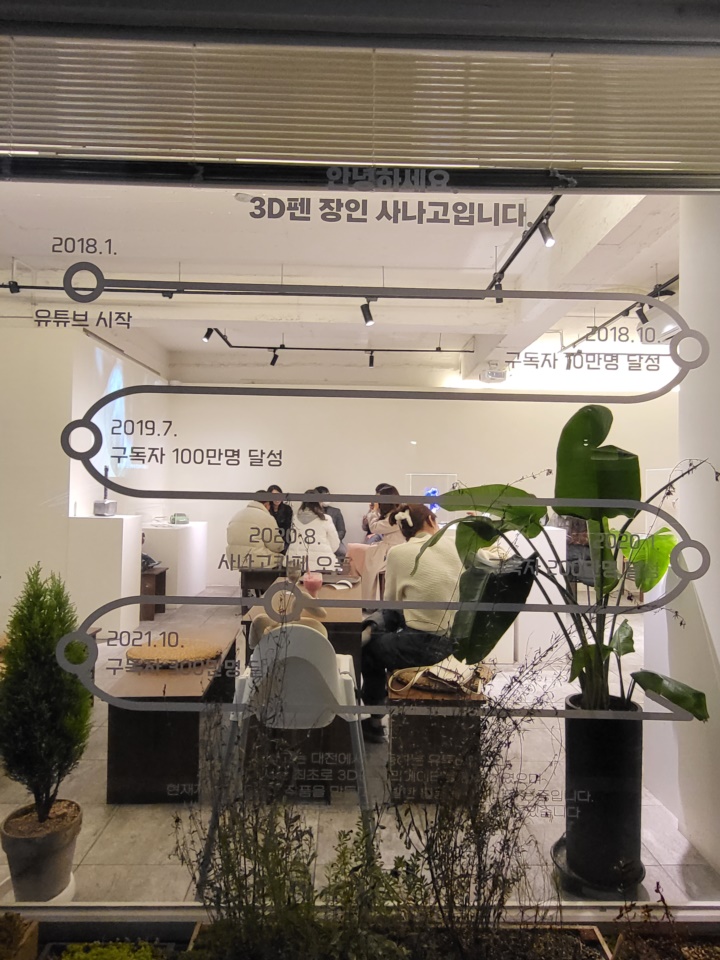 이날도 꽤나 추워서 곧바로 공영주차장으로 향하려는데 아이가 사나고 카페 유리창에 그려진 연혁을 꼭 찍어야 한다고 해서 찍어왔다. 이거 왜 찍어야 함? ㅎㅎㅎ 여튼, 오랜만에 다녀온 대전, 짧지만 강렬했다. 대전 사나고 카페 3D펜 장인 유튜버의 작품 감상하며 마카롱 먹고 온 내돈내산 솔직 후기 끝:D