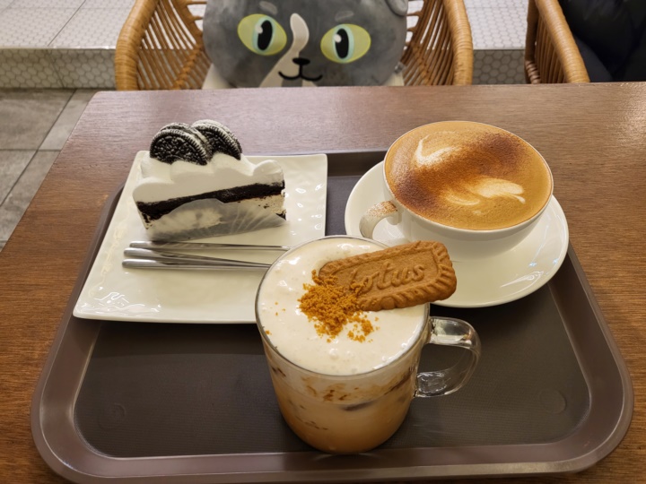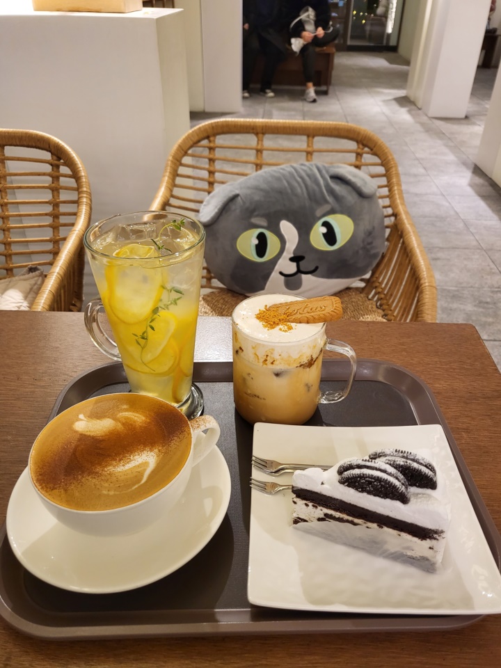 시간 가는 가는 줄 모르고 구경하는 동안 주문한 메뉴가 나왔다. 카푸치노와 로투스크림라떼, 쿠앤크케이크, 레몬에이드를 주문했더니 21,000원이었다.