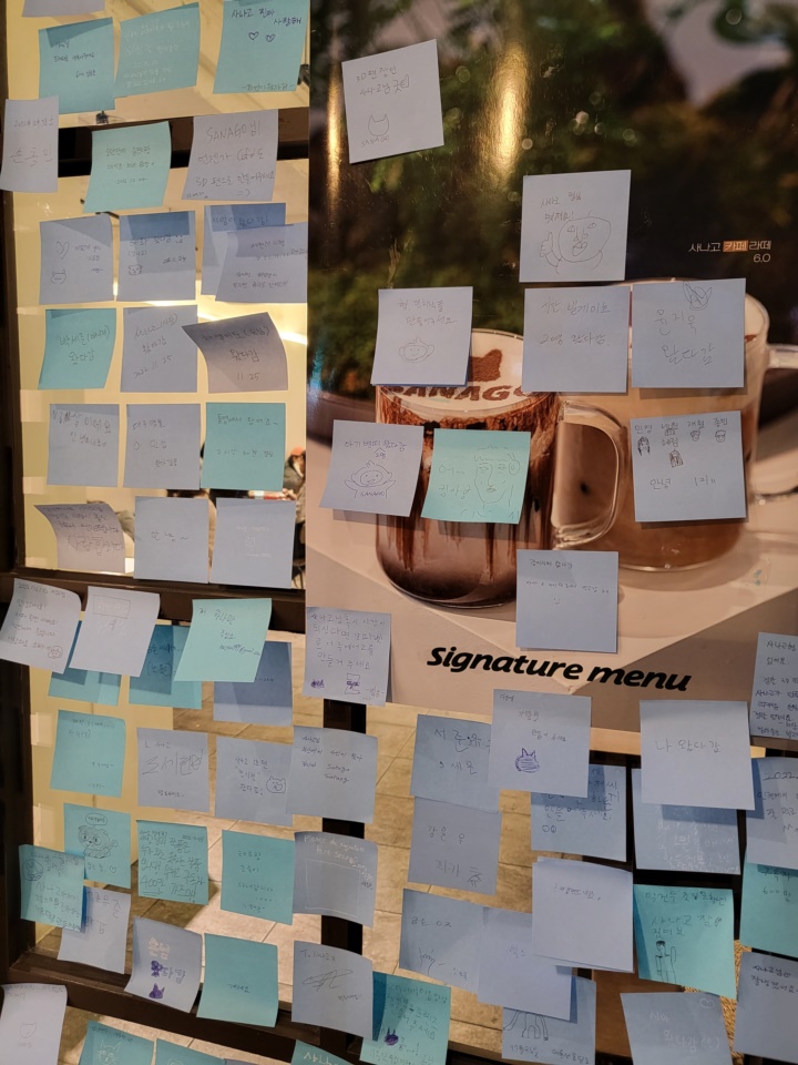 직접 보고 싶었던 3d펜 작품 감상하고, 음료도 마카롱도 맛있게 먹고, 나오는 길에 아이는 포스트잇으로 사나고님께 '이거 만들어 주세요!'라고 써서 붙이고 왔다. 음, 아해야... 근데 나몰빼미는 안 만들어 주실 거 같아 ㅠㅠ