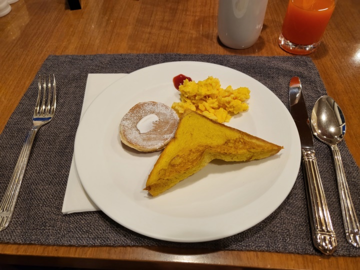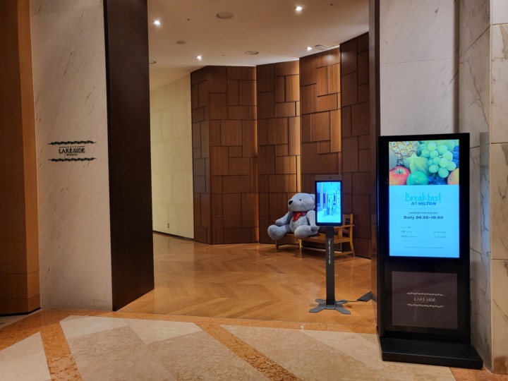 조식 뷔페 레스토랑은 1층 로비 두 기둥 사이에 있는 레이크사이드 카페 (Lakeside Cafe)이다. 조식 운영시간은 06:30~10:00으로 대인은 40,000원이고 소인 (48개월~초등학생)은 23,000원이다. 12월 10일 (토)부터 12월 12일(월)까지 조식 이벤트로 07:10 이전 조식 레스토랑에 입장하면 어린이 1인 무료제공되었다.