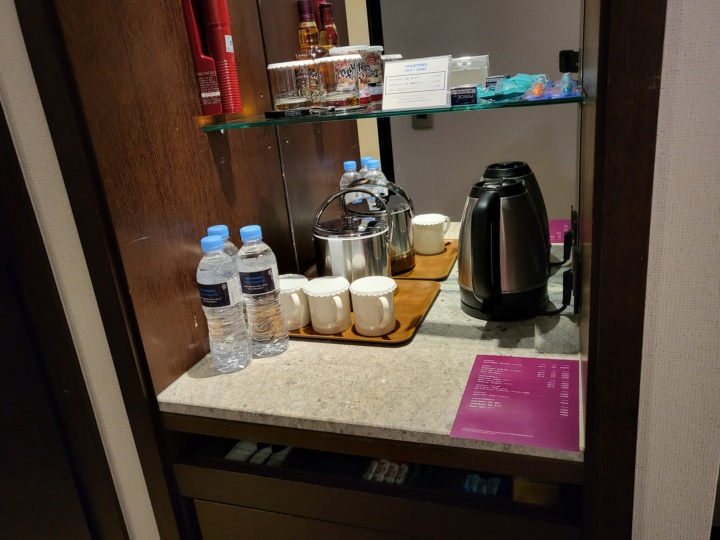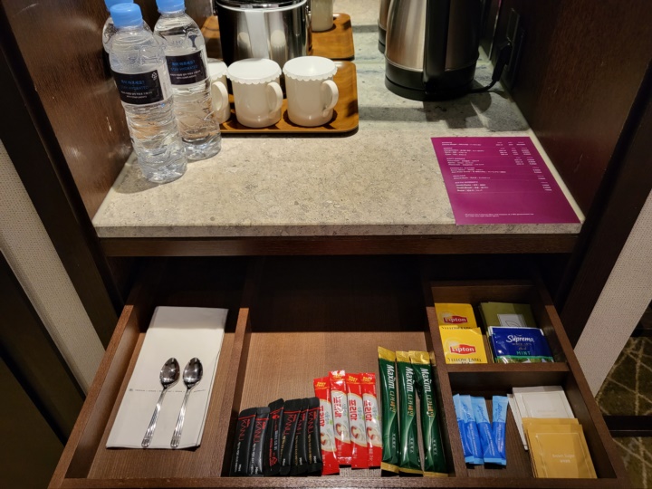 냉장고 밖에 있는 생수(석수)는 무료이지만, 냉장고 안에 들어있는 에비앙은 유료, 커피(카누, 맥심 디카페인)와 홍차, 녹차 등 티백도 준비되어 있다.