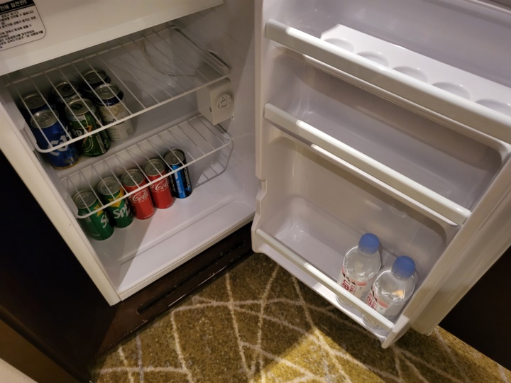 힐튼 경주 디럭스 트리플 패밀리룸 미니바 냉장고 안팎의 대부분의 음료와 간식, 칫솔 등은 유료이다. 생수 3병은 무료이고 얼음은 복도 나가면 ICE라고 표시된 문을 열고 이용할 수 있어서 편하다.