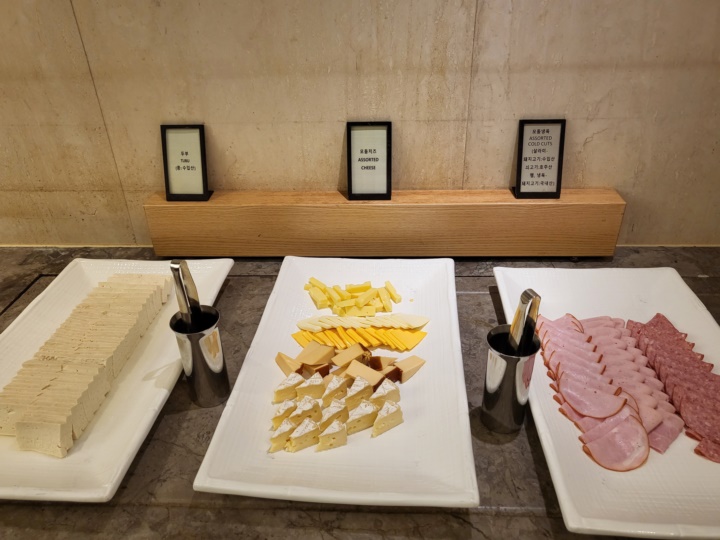 이용객이 거의 없어서 여유 있게 찍을 수 있었던 경주 힐튼 조식 뷔페 메뉴 사진, 메뉴가 너저분하지 않고 즐겨 먹을만한 메뉴 위주로 깔끔하게 준비되어 있다.