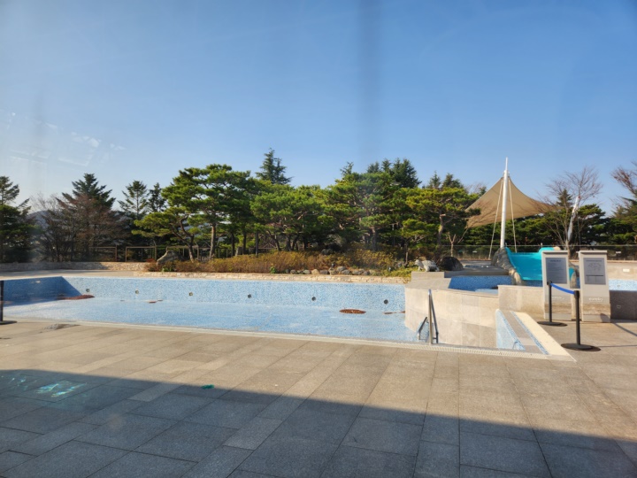 수영장은 투숙객 대인 2인과 소인 2인 동시입장 기준으로 1박당 오전 또는 오후 중 1회 이용이 가능하다. (재입장 시 비용발생) 추가인원 요금은 대인 40,000원 / 소인 35,000원이며 재입장 요금은 투숙객 50% 할인 적용되어서 대인 20,000원 / 소인 17,500원이다. 수영장은 13:00~13:30 시설 정비로 이용이 불가하다. 야외 수영장은 12월 중순 기준 운영하고 있지 않았다.