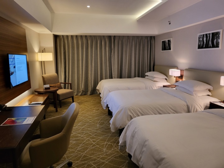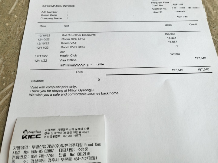 우리 가족은 3인이라 이번에 디럭스 트리플 패밀리로 예약을 했다. 객실 타입, 투숙 일자와 요일 등에 따라 숙박요금은 차이가 있는데 우리가 투숙했을 때는 30만 원 정도였다. 체크아웃할 때 받은 인보이스에는 197,540원이라고 찍혀있는데 힐튼 포인트를 털었고, 사우나 비용 12,000원이 포함된 가격이라서 실제 숙박비로 계산해보면 30만원 정도인 셈이었다.