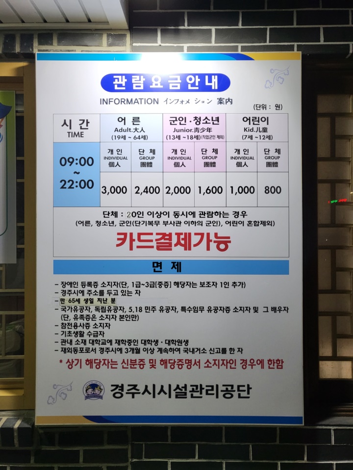 관람료 할인과 면제 20인 이상 단체가 동시관람하는 경우 입장요금 할인이 되며, 장애인 등록증 소지자, 경주시에 주소를 두고 있는 자, 국가유공자 등은 관람료가 면제된다. 설날 및 추석연휴 한복착용자 (외국인 포함), 어린이날 (어린이에 한함)도 관람료가 면제된다.