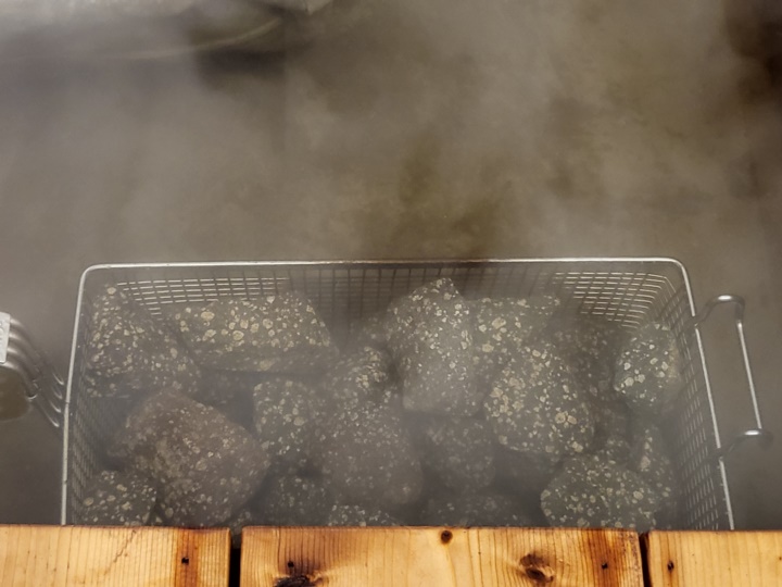 한약재료가 들어가 그윽한 약초향이 풍기는 건강한 해수, 이것만도 엄청 뜨거운데 여기에 구운 맥반석 돌 바가지도 또 넣어준다. 이렇게 해서 고온이 1시간 30분 이상 유지되는 것이다.