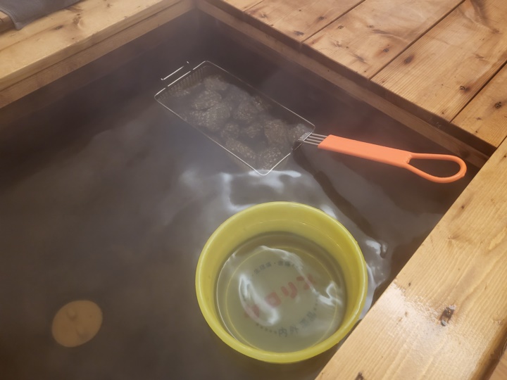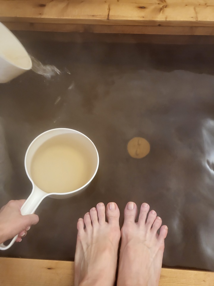 시간이 지나 물이 식었다 싶으면 직접 물을 붓거나 족욕, 반신욕을 즐길 수도 있다. 물이 상당히 고온으로 꽤 오래 유지되어 발을 잠깐 담그는 것 외에 반신욕은 엄두도 낼 수 없었다. 훈증도 좋지만 반신욕 더 좋아하는 편이라 약간 아쉬웠다. 물이 금세 식을 줄 알았는데 1시간 반동안 유지되다니... ㅎㄷㄷ