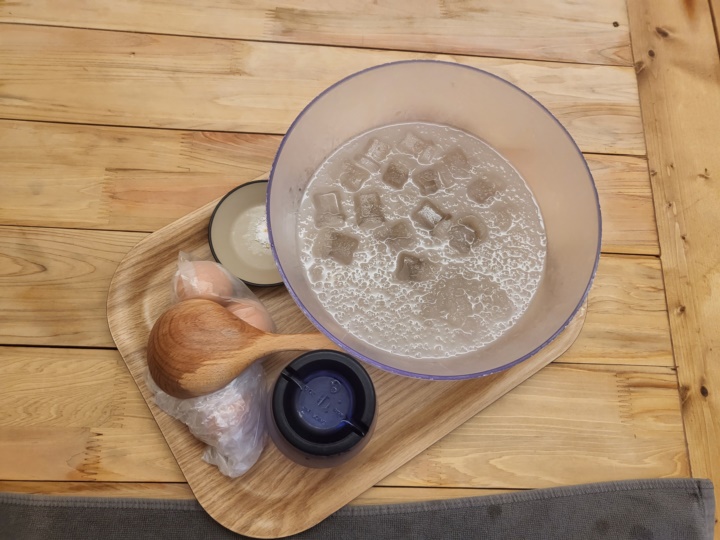 한참 해수찜을 즐기고 있을 즈음, 입실하기 전에 미리 주문해둔 구운 계란과 식혜가 도착했다. 식혜가 왜 1만 원이나 하나 싶었는데 이렇게 볼에 담아 넉넉한 양이 나오기 때문에 국자로 퍼서 둘이 나눠 먹기에 충분한 양이다. 둘이서 솔밭해수방 방문한다면 이 조합 추천드림:D