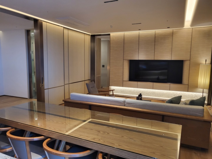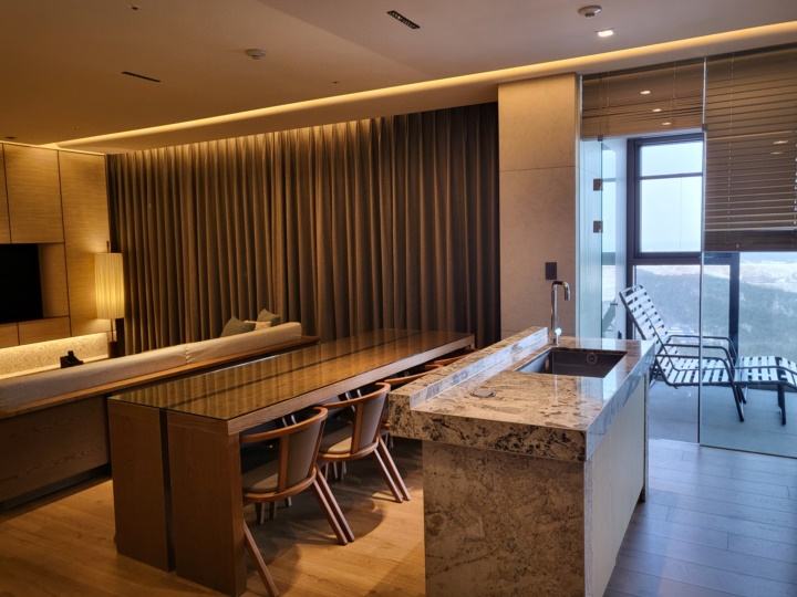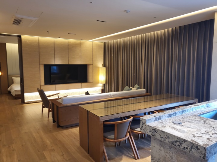 벽걸이 TV와 테이블, 소파로 구성된 로얄 스위트룸 거실, 주방과의 사이에 8인용 테이블을 두어서 공간 동선을 잘 활용했다. 둥근 식탁보다 직사각형 식탁이 공간 구획이나 사용편의성이 더 높은 듯.