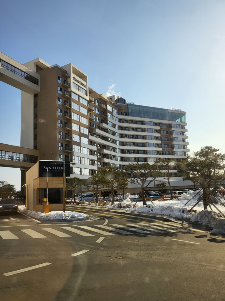 설악산 울산바위 뷰로 유명한 고성 델피노 리조트는 소노캄, 소노문, 소노펠리체로 구성되어 있다. 정문을 통과하여 첫 번째 건물인 이스트타워로 우회전을 하면 소노펠리체가 보인다.