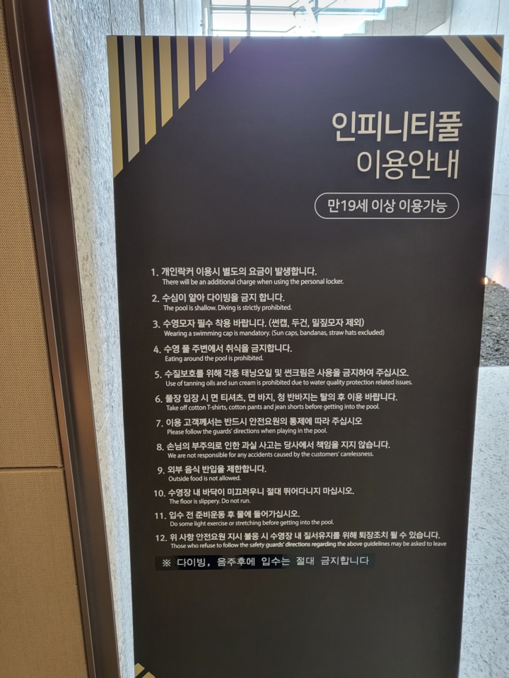 하지만 만 19세 이상만 이용가능하고, 이용요금이 주중 35,000원 / 주말 50,000원으로 주말에 둘이서 가면 10만 원.... 겨울에 소노펠리체 인피니티풀에서 찍은 사진 보니 정말 멋있던데 인생샷을 남기고 싶다면 가볼 만한 프라이빗한 공간이다.