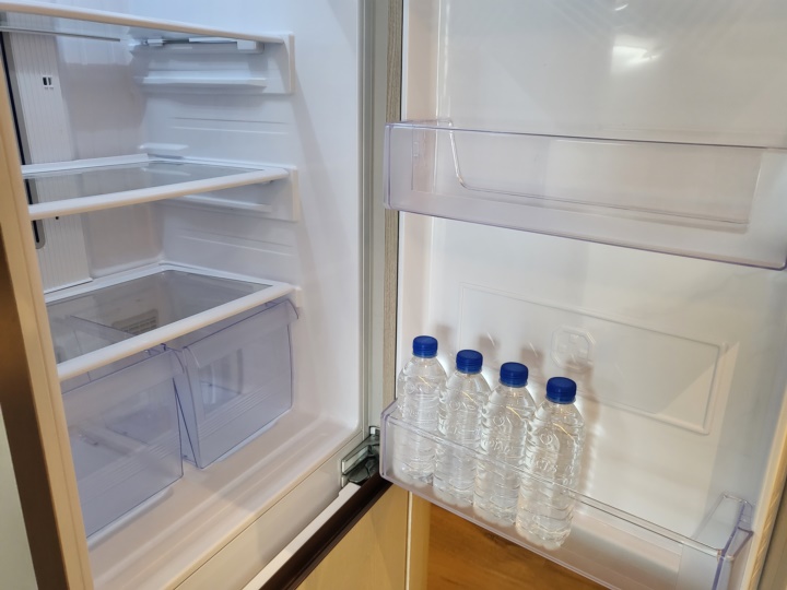 상 냉장, 하 냉동 / 냉동고는 냉텅이고, 냉장고 안에는 생수 4병이 들어있다. 사이즈가 넉넉해서 여행하면서 과일, 주류, 얼음 채워 넣고 먹기 충분했다.