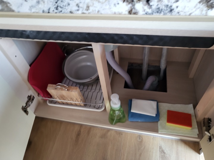 대면형 주방으로 사각 싱크대 아래로는 건조대, 주방세제와 수세미, 도마 등이 구비되어 있다. 이걸 나중에 발견하여 사용하지 못했음 ㅠㅠ