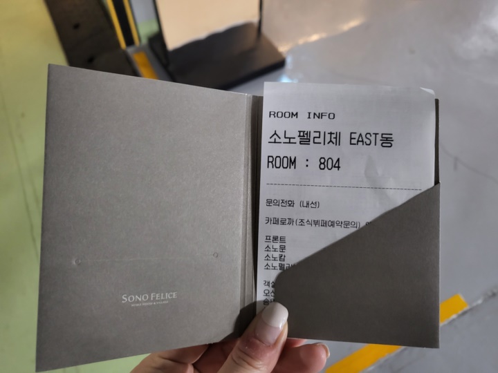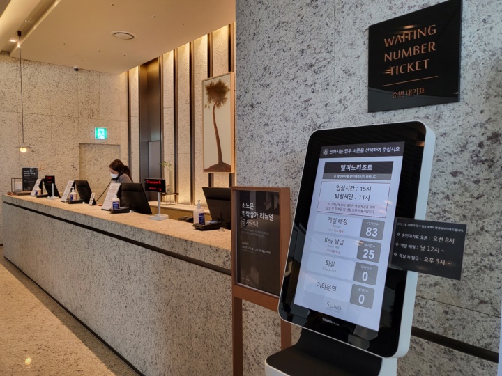 소노펠리체 숙박할 경우 객실 배정을 위해서는 소노펠리체 10층 프런트 키오스크에서 번호표 발급받고 대기를 해야 한다. 번호표 발급 시작 시간은 오전 8시이고, 객실배정은 12시부터 순차적으로 진행된다.