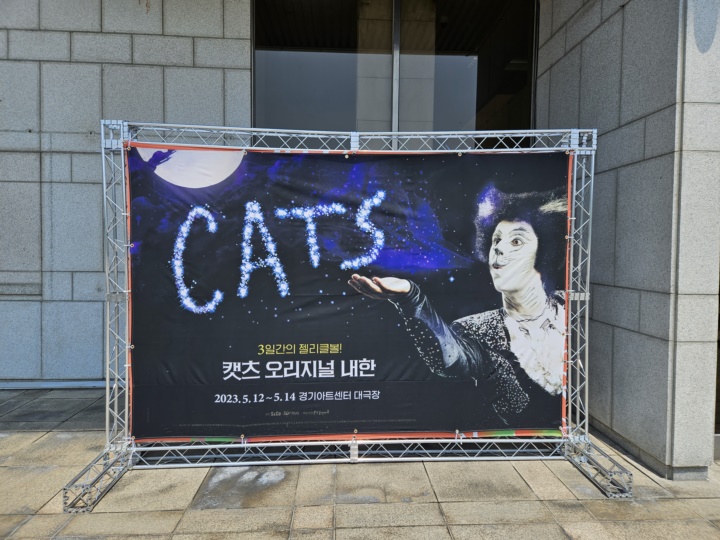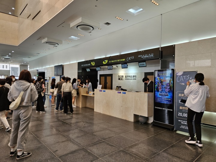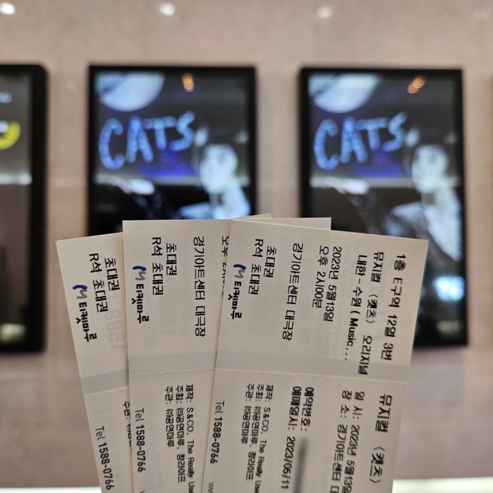 뮤지컬 캣츠 수원 오리지널 내한 공연은 2023년 5월 12일~5월 14일 경기아트센터 대극장에서 3일간 진행되었다. 포토존이 많지 않아서 아쉬웠다. 대극장 출입문 옆쪽이랑 1층 2번 게이트 앞에서 주로 티켓과 함께 인증샷을 찍는 줄이 길게 늘어섰다. 우리는 5월 13일 2시 공연이라서 12시 30분쯤 도착해서 미리 발권하고, 사진도 찍고, 근처 식당에서 점심도 먹고, 공연을 관람할 만반의 준비를 갖추었다 :)