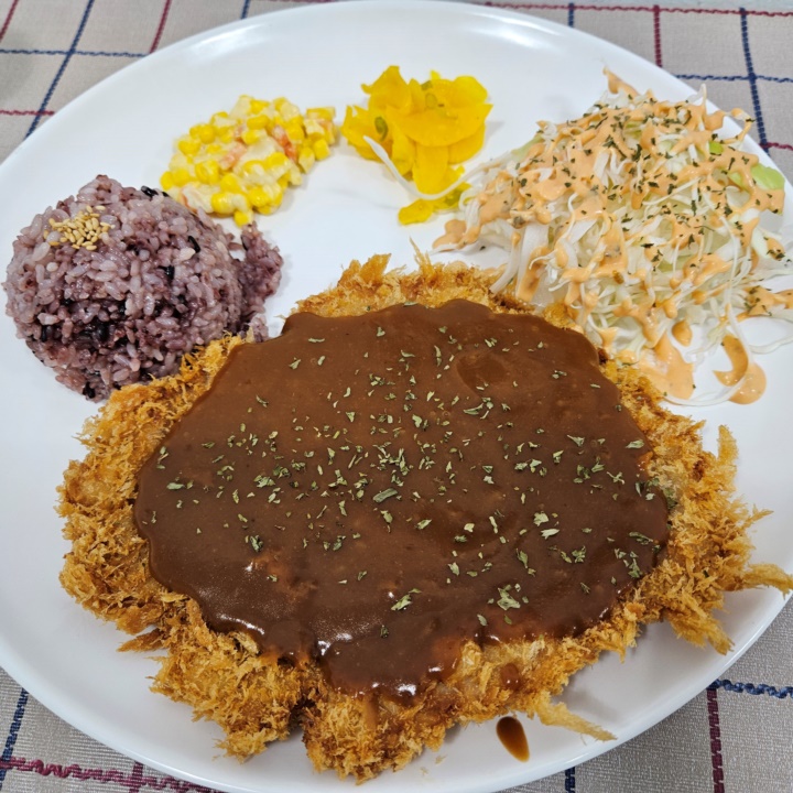 단품이 3천 원인 것에 비해 정식은 약간 비싼 감이 있지만 비교해 보기 위해서 하나씩 주문했다. 정식에는 흑미밥, 콘샐러드, 단무지, 양배추 샐러드가 곁들여진다. 가성비를 위해서라면 그냥 단품만 먹는 게 좋은데 돈까스만 먹을 때는 물리니까 이렇게 먹는 것도 좋을 듯.
