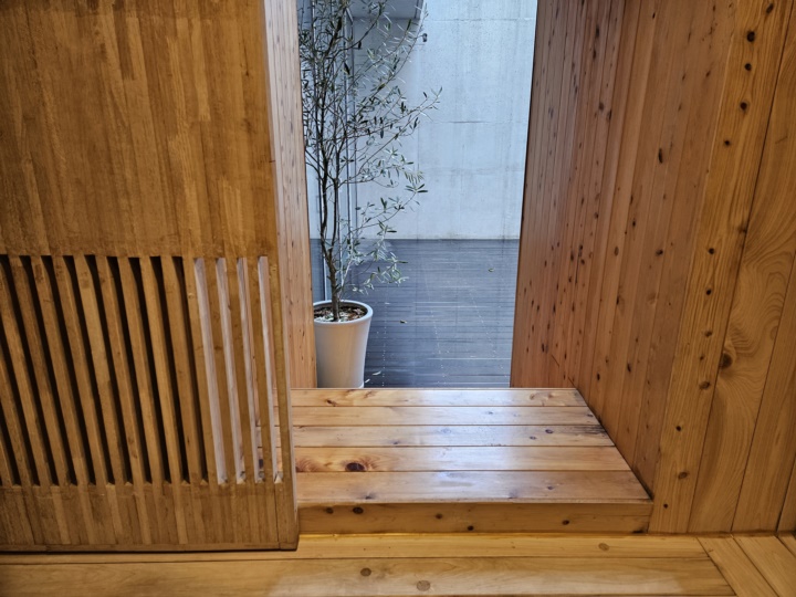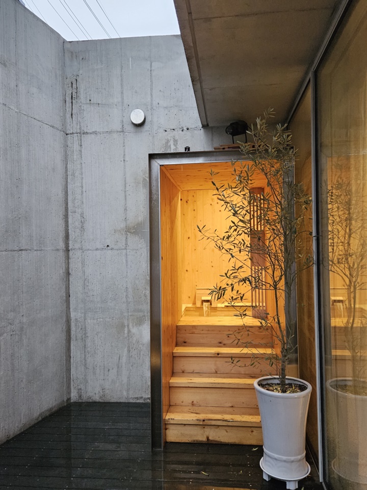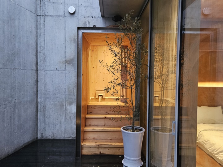 메인룸에서 문을 열고 밖으로 나가면 천장이 오픈된 야외 테라스와 연결된다. 여기에서 히노끼탕으로 바로 연결되는 문도 있어서 비 오는 날에는 더욱 좋았다. 빗소리 들으면서 반신욕을 즐기니 제대로 힐링타임! 통영 이티미니호텔 코지룸을 선택한 이유가 바로 이것 때문이었다.