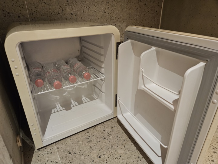 메인룸과 리빙룸 쪽은 카펫이 깔려 있는데 욕실뿐은 타일 마감이라 물기가 있을 경우 미끄러울 수 있다. 전면에 보이는 화장대에는 드라이어가 준비되어 있고, 그 아래에 있는 게 냉장고이다. 냉장고 안에는 생수 4병이 들어 있다.
